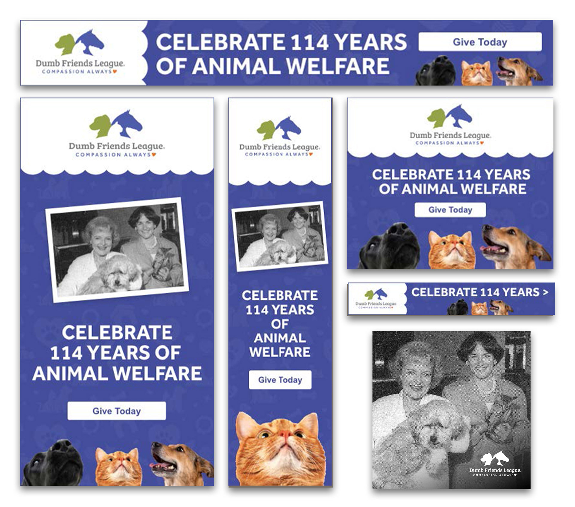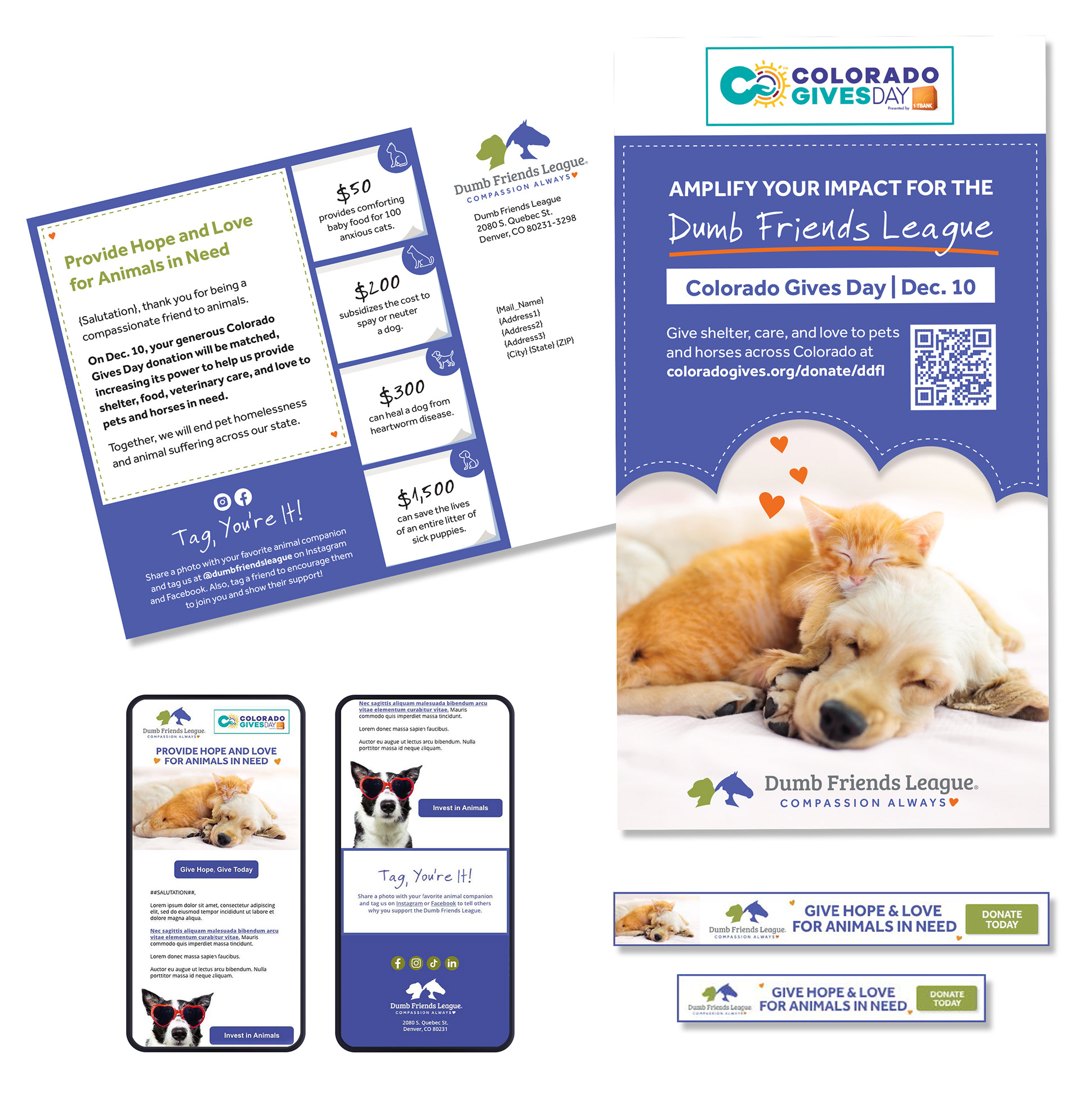 I collaborated with the Dumb Friends League team on multiple fundraising and awareness campaigns, designing print and digital materials that aligned with their established brand while communicating compassion, urgency, and trust. These pieces supported donor engagement and helped tell the stories of the animals and programs at the heart of their mission.